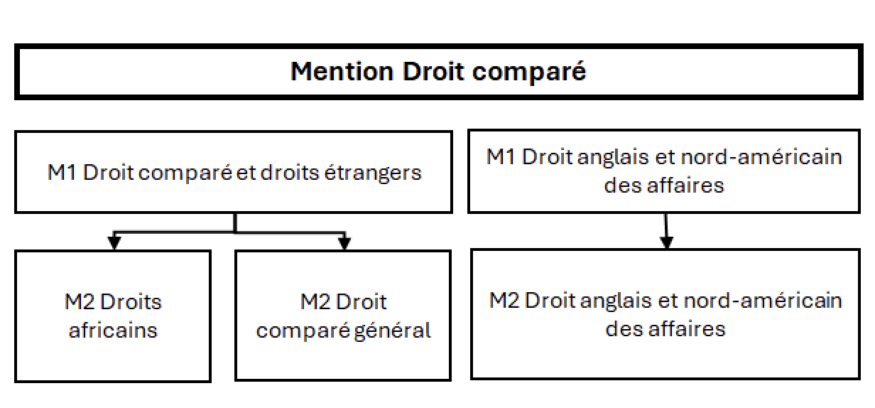 - Parcours "droit comparé et droits étrangers". La première année de ce parcours sur deux ans propose un socle commun d’enseignements : droit comparé, droits étrangers, droit international public, droit international privé, droit européen. Ce parcours de master 1 débouche, sur décision souveraine d'affectation de la commission des voeux du parcours, sur deux masters 2 : i) Master 2 Droit comparé général, ii) M2 Droits africains.
