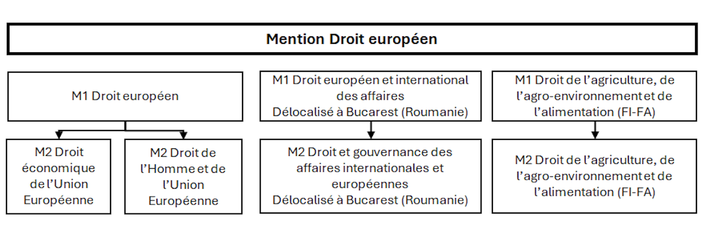 La Mention de master Droit européen comporte trois parcours distincts, respectivement conçus sur deux années selon une organisation tubulaire : les étudiants ayant validé leur première année de master ont un droit à la poursuite d’études en master 2 au sein de leur parcours.