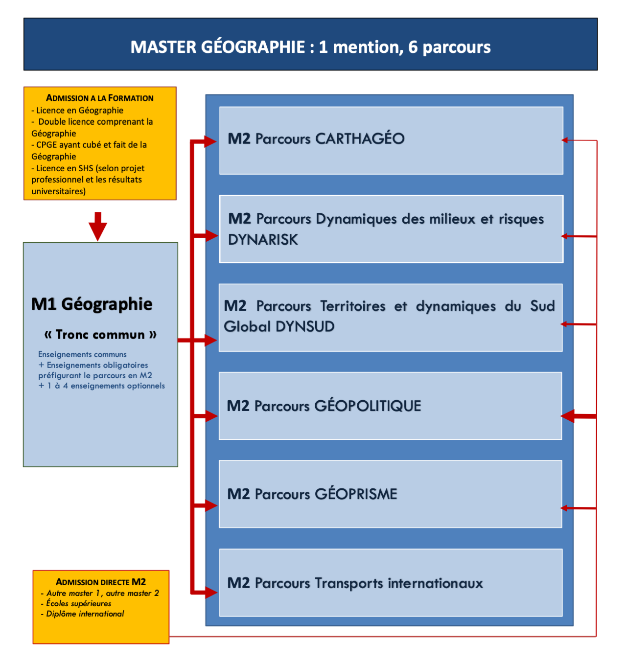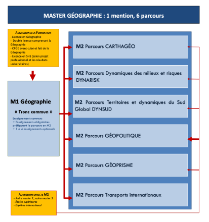 La mention Géographie réunit six parcours de master (Géoprisme, Carthagéo, Géopolitique, DYNSUD-Territoires et Dynamiques du Sud Globlal, Dynarisk, Transports internationaux).